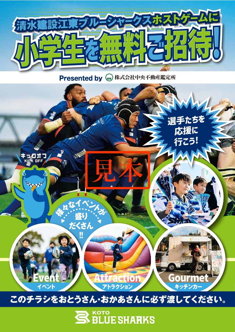 CSR活動の一環として2026年シーズン、弊社がスポンサーとなってラグビーリーグワン・清水建設江東ブルーシャークスの主催試合に小学生のお子さんと保護者の方をご招待しております。