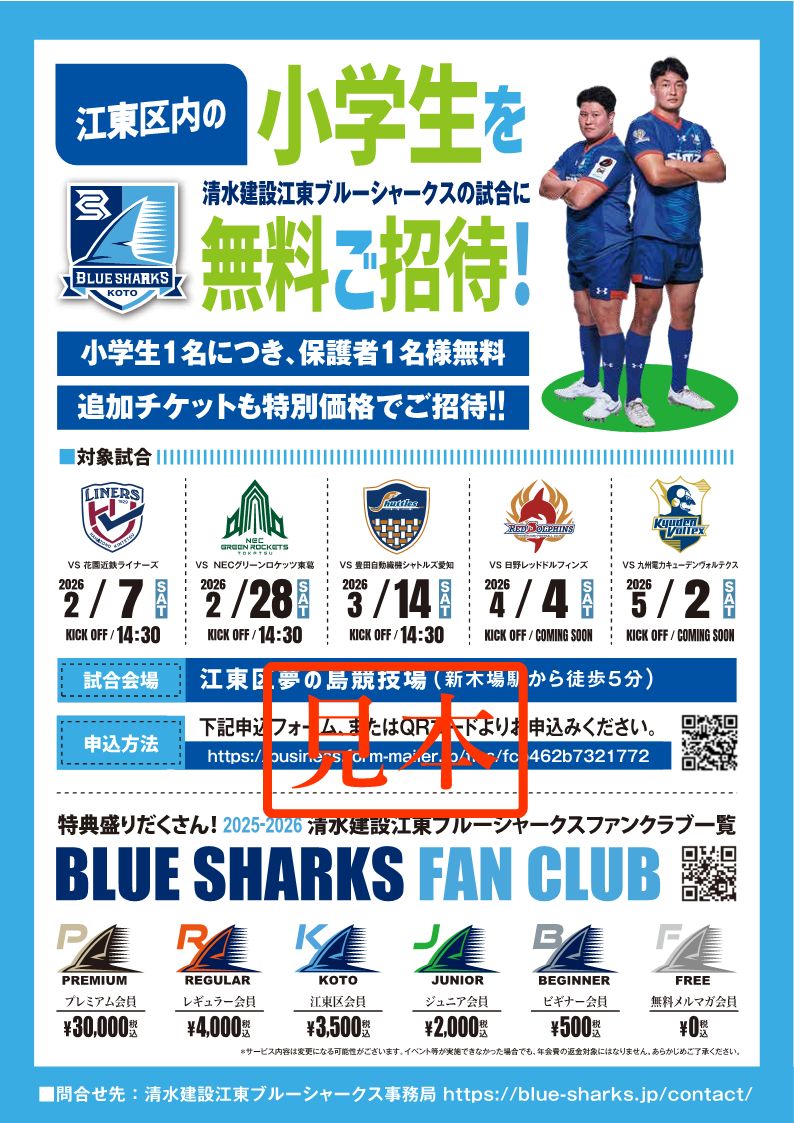 CSR活動の一環として2026年シーズン、弊社がスポンサーとなってラグビーリーグワン・清水建設江東ブルーシャークスの主催試合に小学生のお子さんと保護者の方をご招待しております。